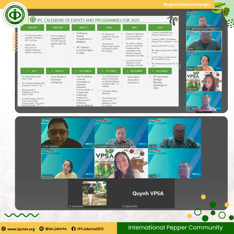 On 3 July 2025, IPC Executive Director Ms. Marina N. Anggraini met virtually with Ms. Hoang Thi Lien, Chairperson of the Viet Nam Pepper and Spices Association (VPSA), to reaffirm the ongoing collaboration between IPC and one of its key partners. The discussion touched on upcoming IPC activities and explored potential areas for continued cooperation, in line with IPC’s mission to foster synergy among member countries and strengthen the global pepper ecosystem. Focused, forward-looking, and grounded in shared priorities, because meaningful partnerships begin with clear alignment. #InternationalPepperCommunity #IPCUpdates #TradeDialogue #PepperCooperation #AgriTradeMatters #SpiceSector #VietNamPepper #IPCSecretariat #SustainableTrade